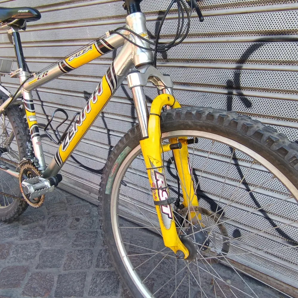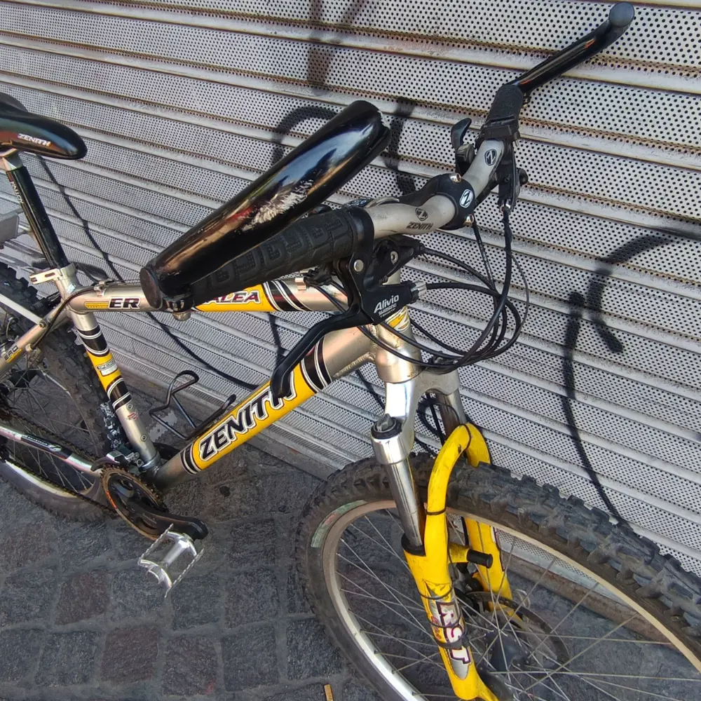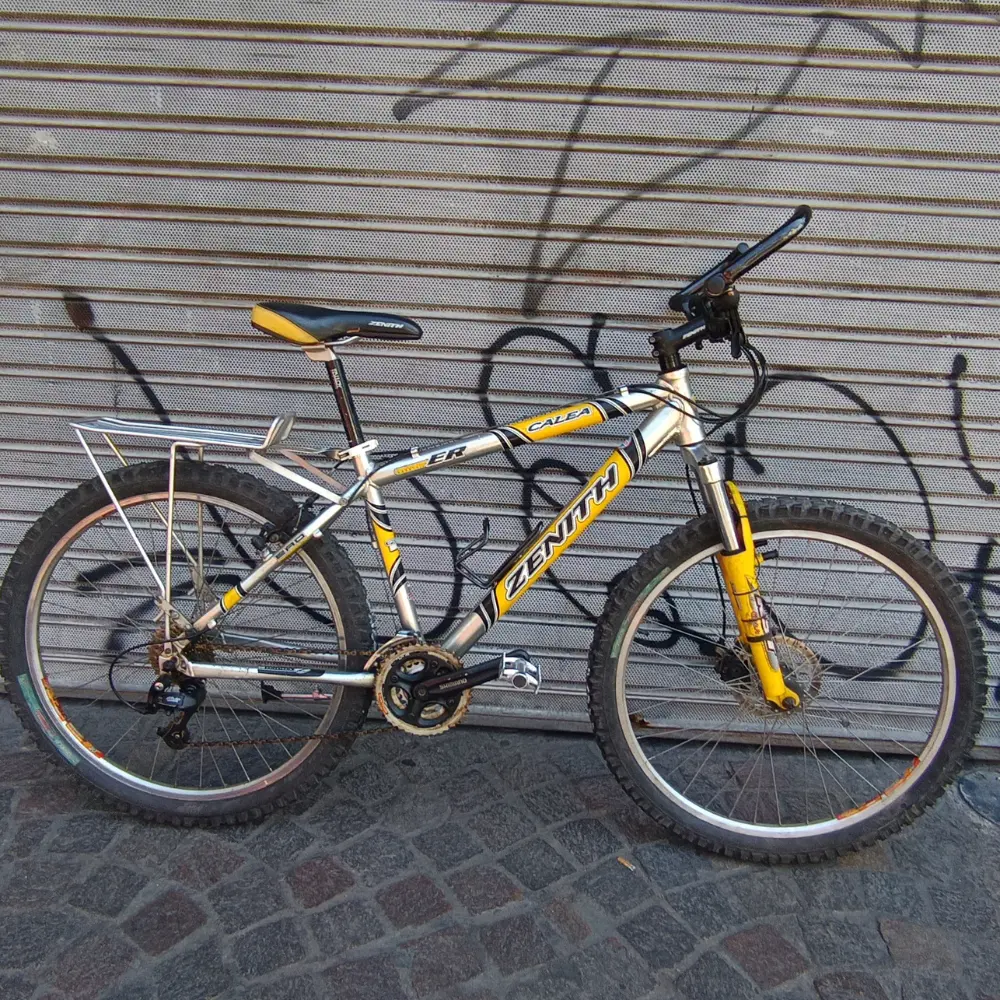 RODADO: 26 COLOR: PLATEADA Y AMARILLA TRANSMISIÓN 3X9 SHIMANO ALIVIO, FRENO A DISCO DELANTERO Y FRENO V-BRAKE TRASERO SHIMANO, MAZA SHIMANO, SUSPENSIÓN RST, PORTAPAQUETES.